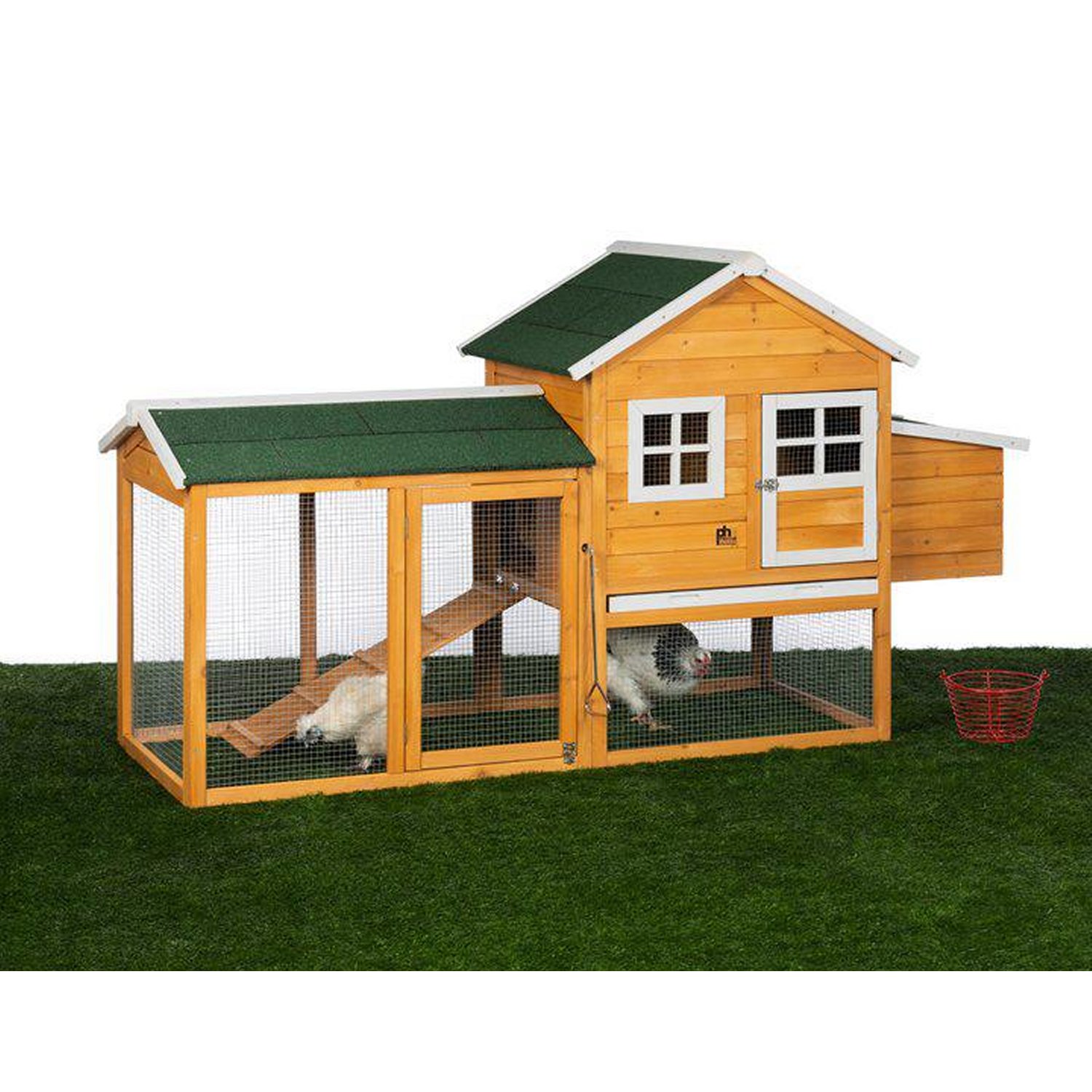 • Coop area with two roosting bars, and a galvanized tray floor for cleaning