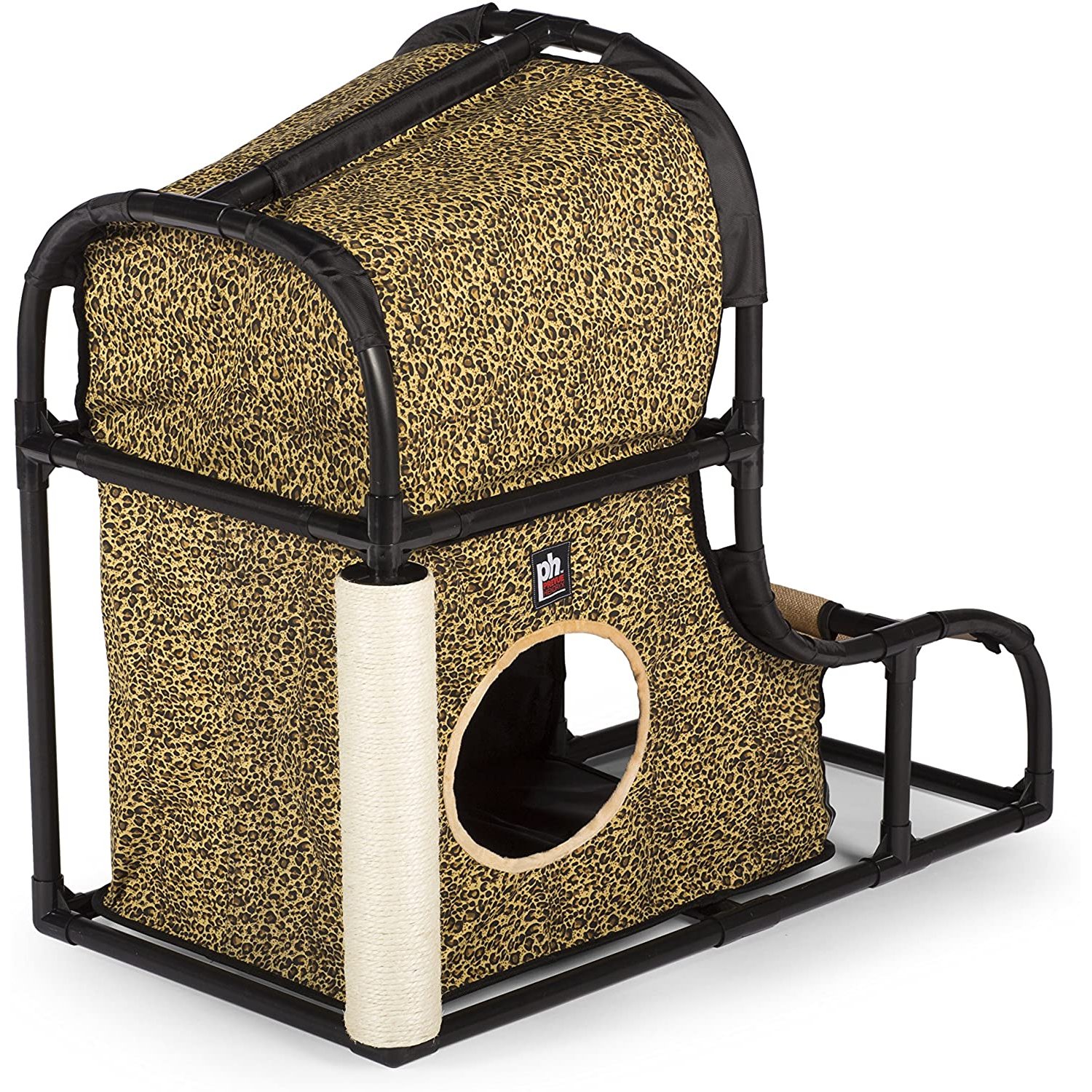 Prevue Pet Products Catville Loft 7220 in Leopard Print encourages your cat to be healthy, happy and active! Watch as kitty engages in frisky activity – playing with the dangling toy, scratching the sisal covered post or climbing in, out, over and around the Catville Loft. The hideaway arch provides an elevated view and contains super-soft plush bedding, perfect for relaxing or sleeping. Durable cloth rampway designed for active jumping, pouncing and running leads to the raised nook where a dangling puff-ball toy hangs playfully. Cats will scratch and stretch along the sisal covered post, getting a good workout while grooming nails and exercising paws. A lower, secluded, hideaway den provides a safe and secure feeling and is also ideal for playing hide & seek. With areas for playing, napping, lounging, scratching, pouncing, climbing and hiding felines love the full range of amenities created to satisfy behavioral instincts while discouraging destructive behavior and alleviating boredom. Prevue’s Catville Loft 7220 is an attractive home for cats of all ages and activity levels. Sturdy, yet lightweight, our leopard print loft comes with easy to follow, step-by-step, assembly instructions and measures 32" Long, 16" Wide, 27" High. Fabric components may be hand washed and air dried as needed.