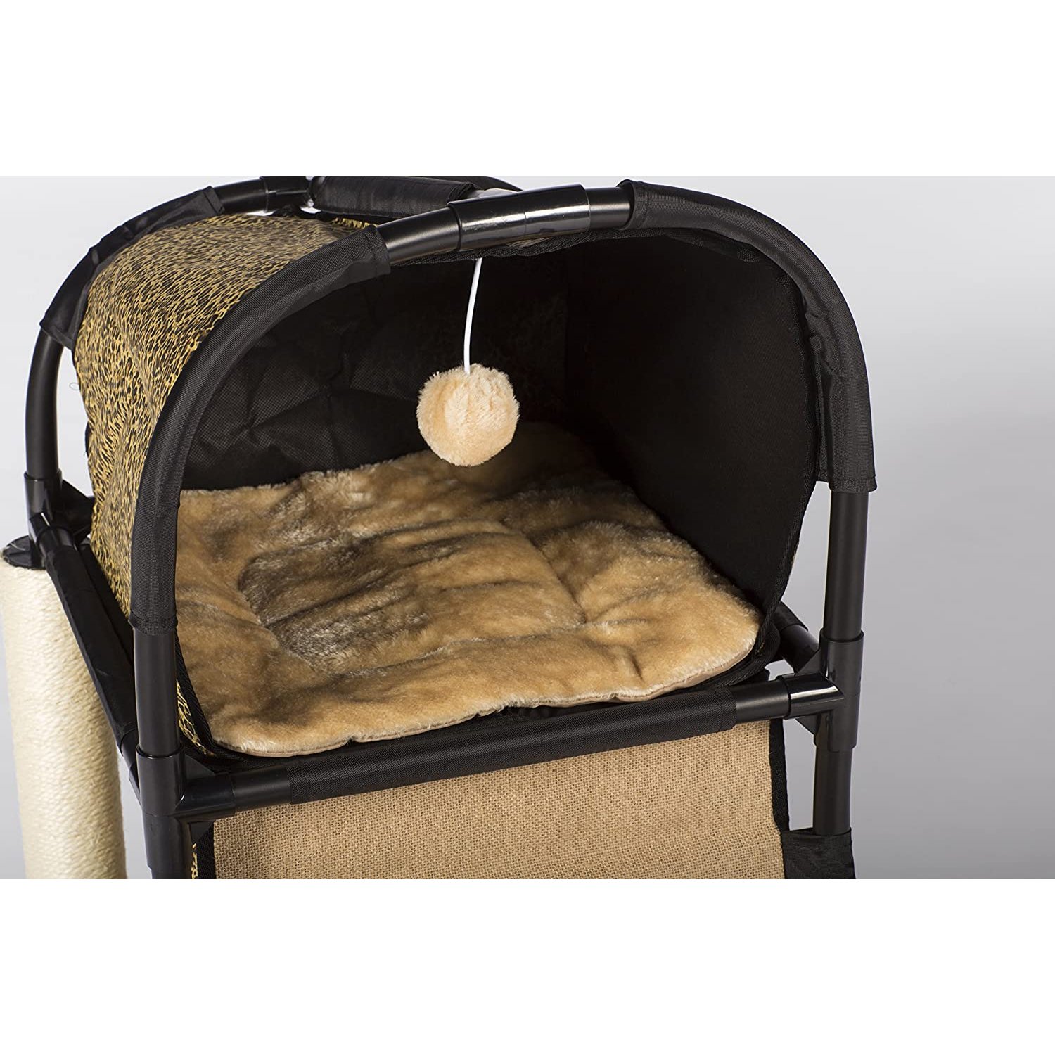 • Two hideaways – an elevated nook with dangling puff ball toy and plush mat plus a more secluded, lower hideaway