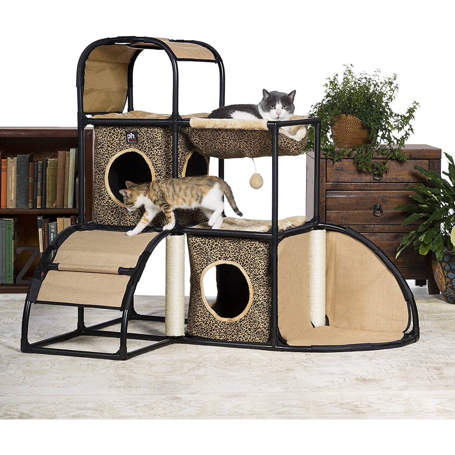 Prevue Pet Products Catville townhome Leopard Print 7235 encourages your cat to be healthy happy and active! watch as kitty engages in energetic activity – playing with the dangling toy, scratching the sisal covered Posts or climbing in, out, over and around the Catville townhome. Cats will happily curl up in either hideaway – one lower-level, one mid-level, each with super soft plush bedding to satisfy all of your cat’s sleeping needs. An additional plush hammock provides the ultimate in lounging pleasure. Two separate scratching Posts encourage exercise as your cat scratches and stretches along the sisal covered Posts, toning muscles while grooming nails and strengthening paws. Durable cloth ramp designed for active jumping, pouncing, climbing and running provides ample opportunity for play. Dens feature more than one doorway making them perfect for games of hide & seek. With areas for playing, napping, lounging, scratching, perching and hiding felines love the full range of amenities created to satisfy behavioral instincts while discouraging destructive behavior and alleviating boredom. Prevue’s Catville townhome Leopard Print and Beige 7235 is a multi-level, multi-purpose, attractive home where multiple cats of any age and activity level will thrive on endless options for sleep or play. Sturdy, yet lightweight, our townhome comes with easy to follow, step-by-step, assembly instructions and measures 45 1/2" long, 31" wide, 42 1/2" high. Fabric components may be hand washed and air dried as needed.